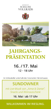 Am Samstag, den 16. Mai geht es ab 17 Uhr entspannt weiter. In der ehemaligen Gärtnerei vor den Toren von Schloss Vollrads laden wir Sie zu einem sommerlichen Sundowner ein.